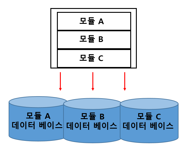 모듈식 모놀리스의 문제 중 하나는 코드 수준에서 지원하는 분해 능력이 데이터베이스 부문에는 부족하므로 향후 모놀리스를 끌어내고 싶을 경우에 중대한 문제에 직면한다는 사실입니다.